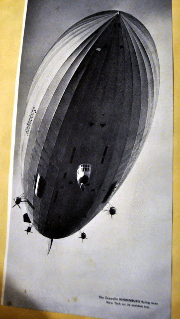Above, the Zeppelin Hindenburg flying over New York on her maiden voyage
